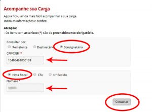 Selecione a opção “Consignatário”, insira o CNPJ da Minucia (15.488.491/0001-39), selecione “Nota fiscal” e o nº da mesma. Clique em “Consultar” logo em seguida