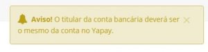 O próximo passo será para enviar o comprovante bancário, note na mensagem que o titular da conta bancária deve ser o mesmo da conta Yapay;