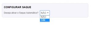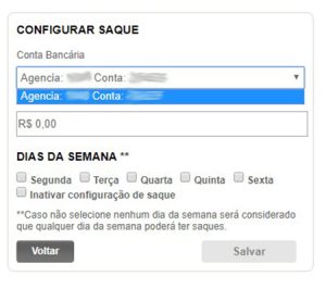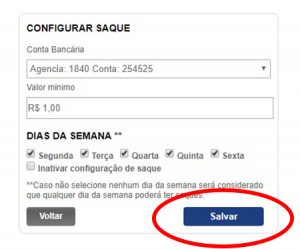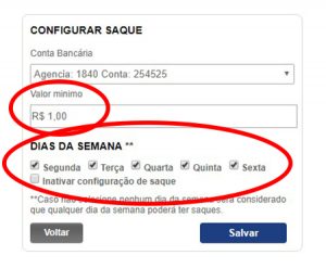 Note que o valor minimo para realizar o saque é de R$ 1,00 ou escolha um outro valor minimo para sacar. Abaixo selecione os dias da semana que deseja que o saque seja feito